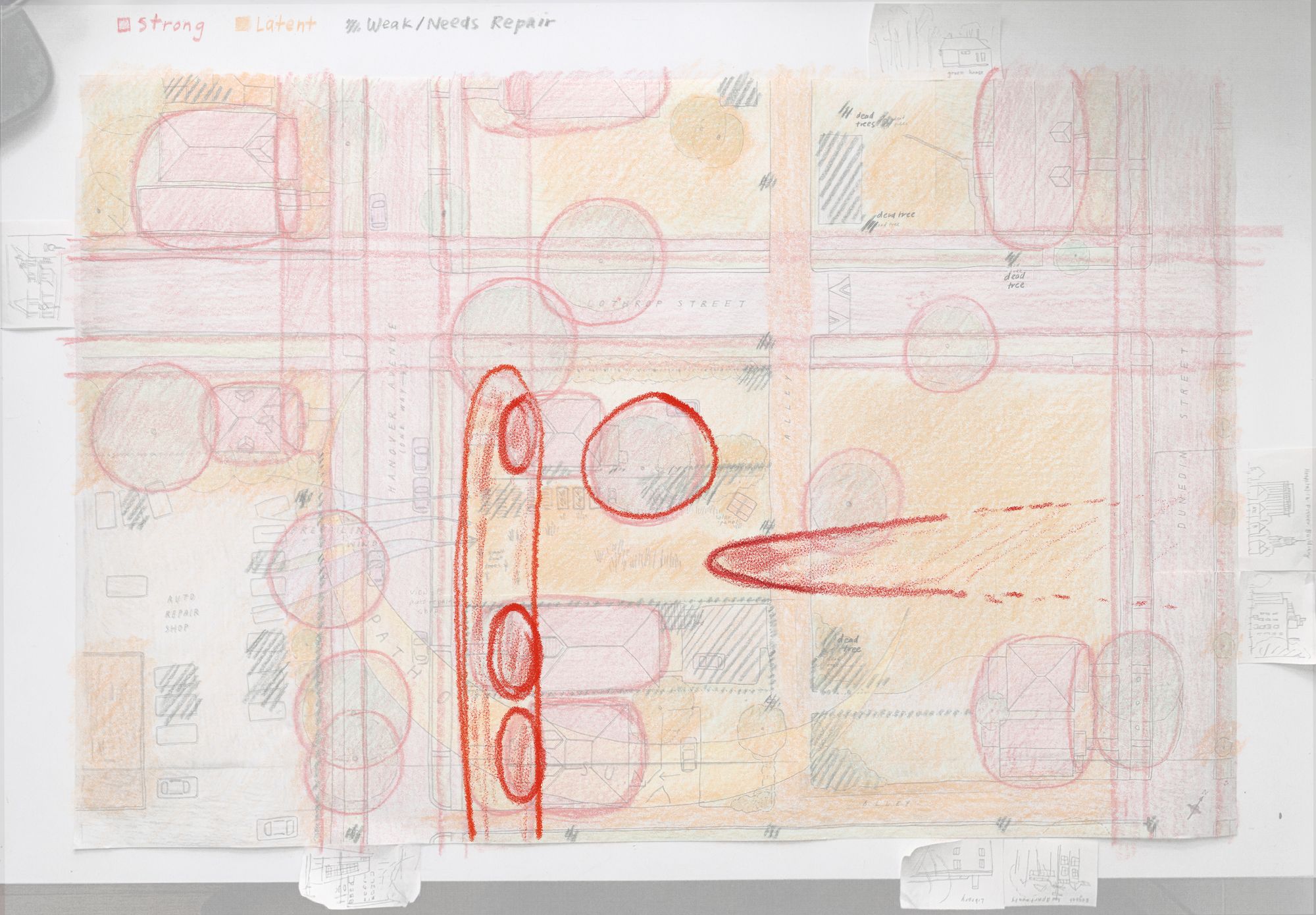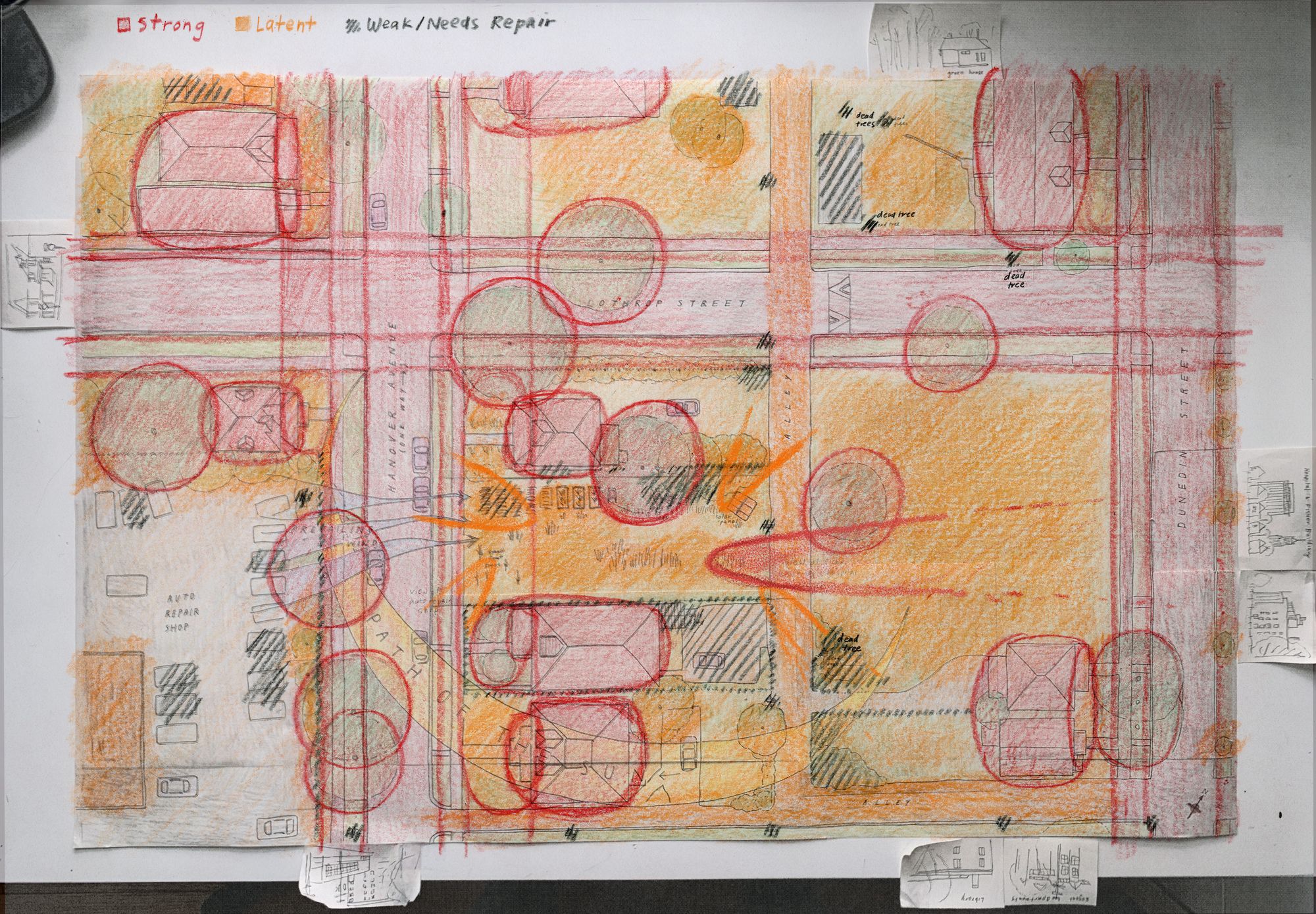 The Field of Centers analysis is a way of mapping out what has a strong presence on the site (large trees, nice houses and views, the volumes of connected street and front yard space), what’s more latent or has potential to become strong, and what is weak and needs repair. In other words, the spots that feel good and the ones that don’t feel so good.