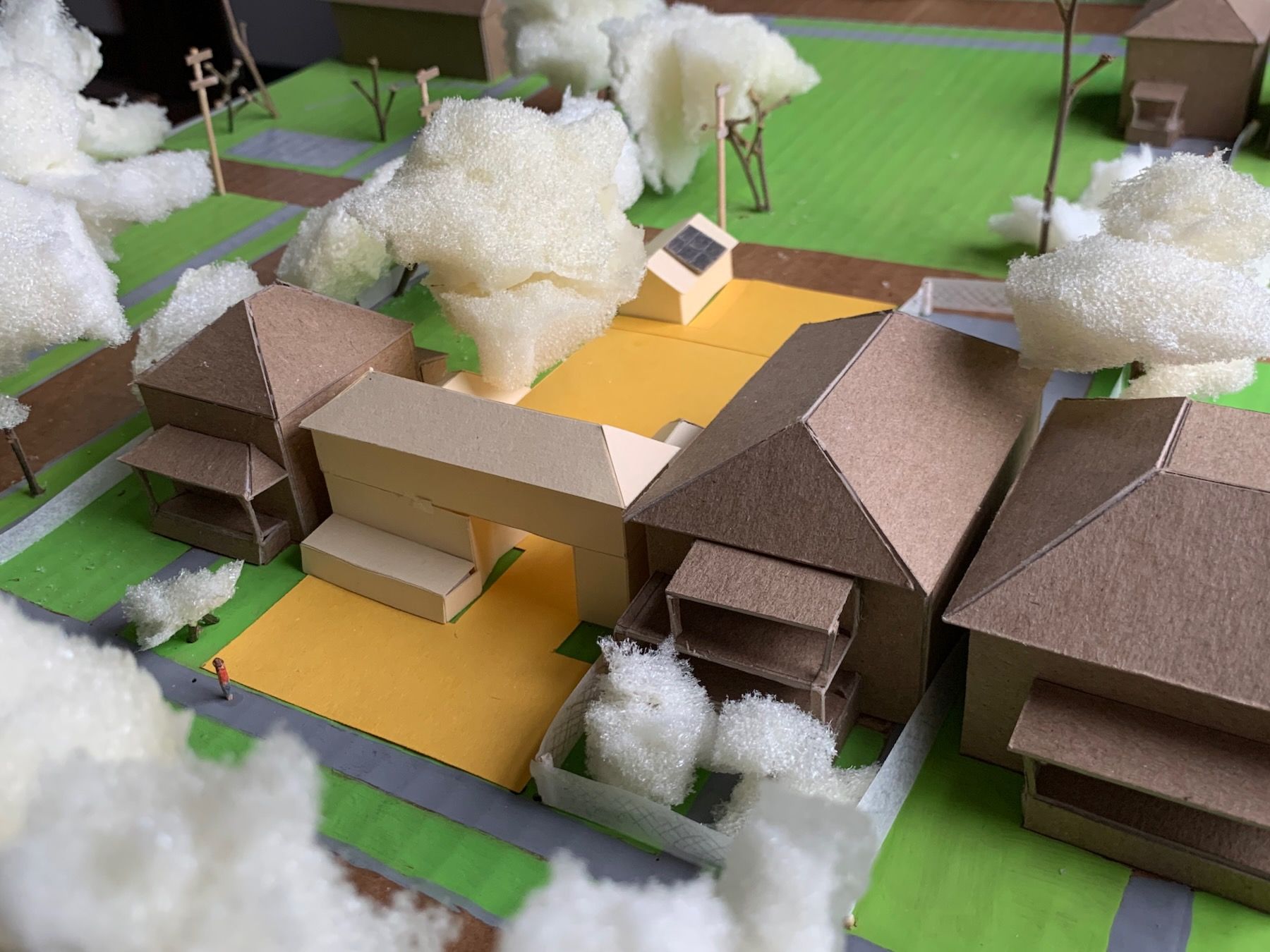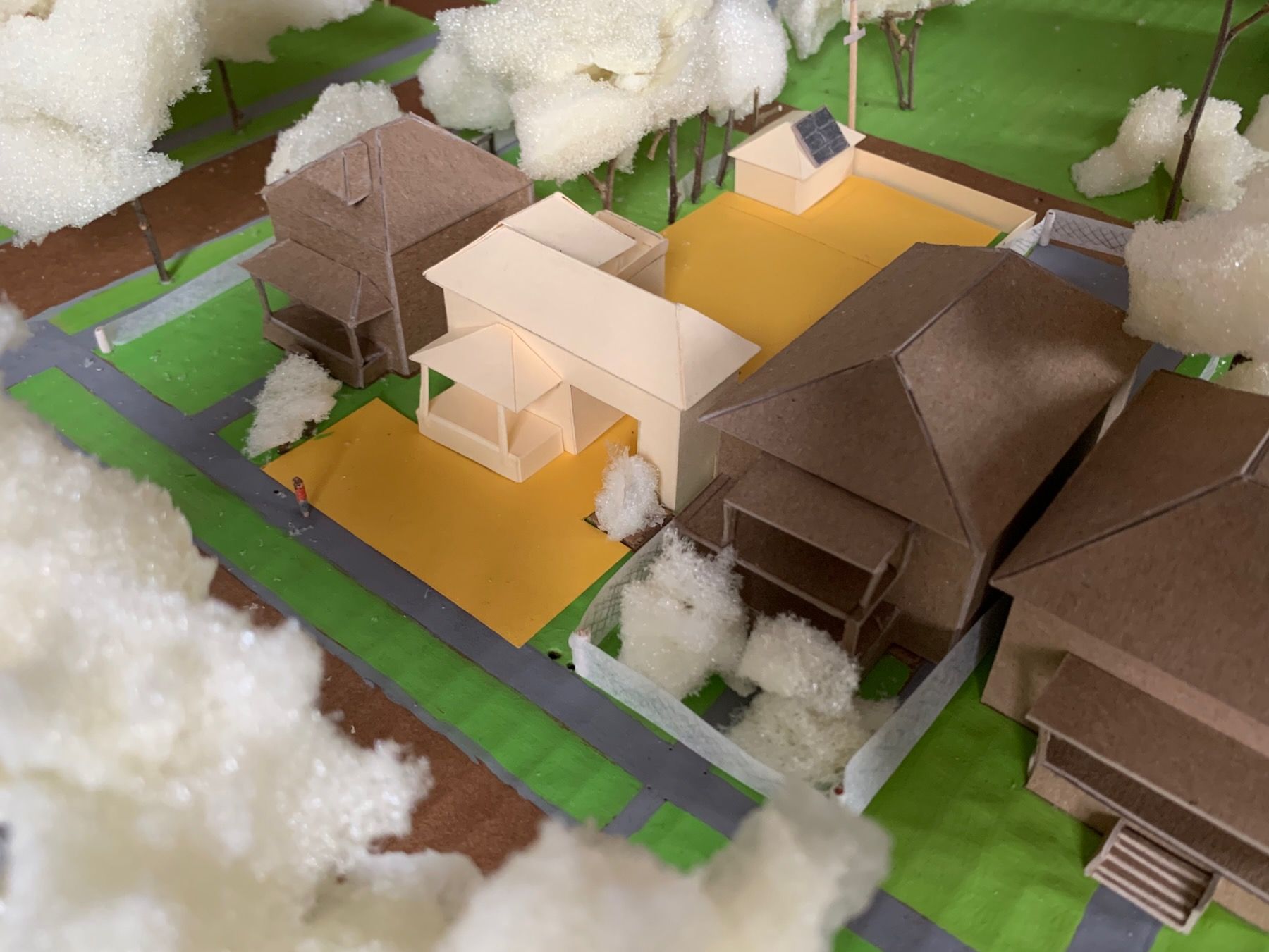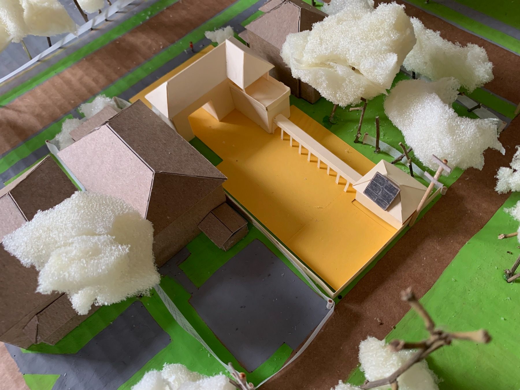 You can see it more clearly here in gold construction paper on my 1:200 model, which I started concurrently after finishing the site map. The houses here are chipboard, the base painted cardboard, and I used twigs and leftover packing foam for trees and bushes:
