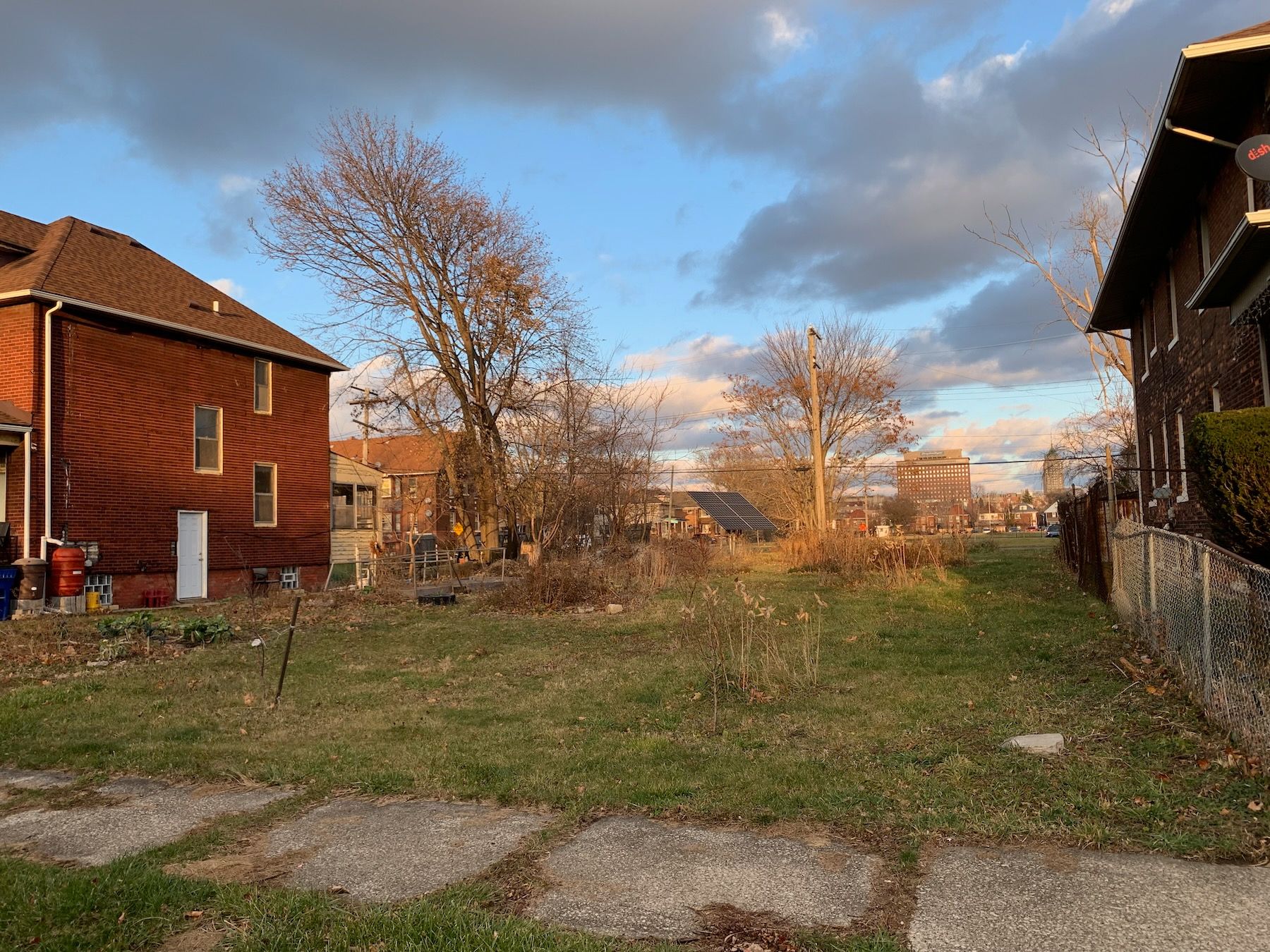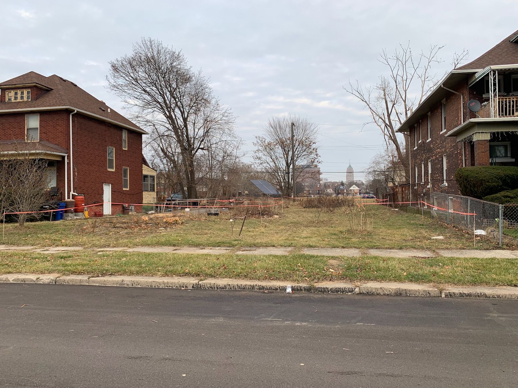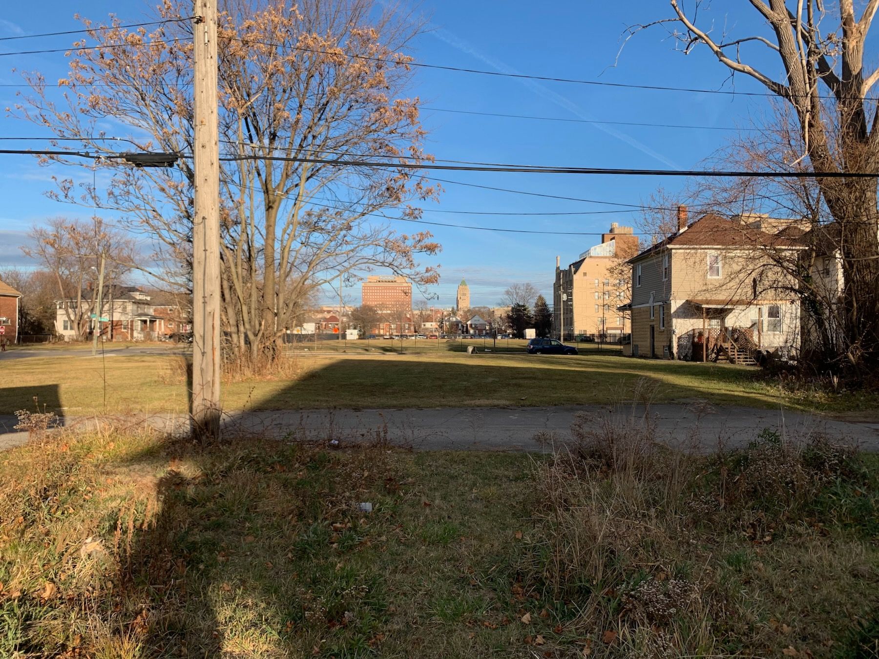 The most striking thing about the lot was the unobstructed view of two tall buildings in the distance: Henry Ford Hospital and, taller but further away, the Fisher Building, an art deco skyscraper in the New Center neighborhood. Both pleasantly lit at night.