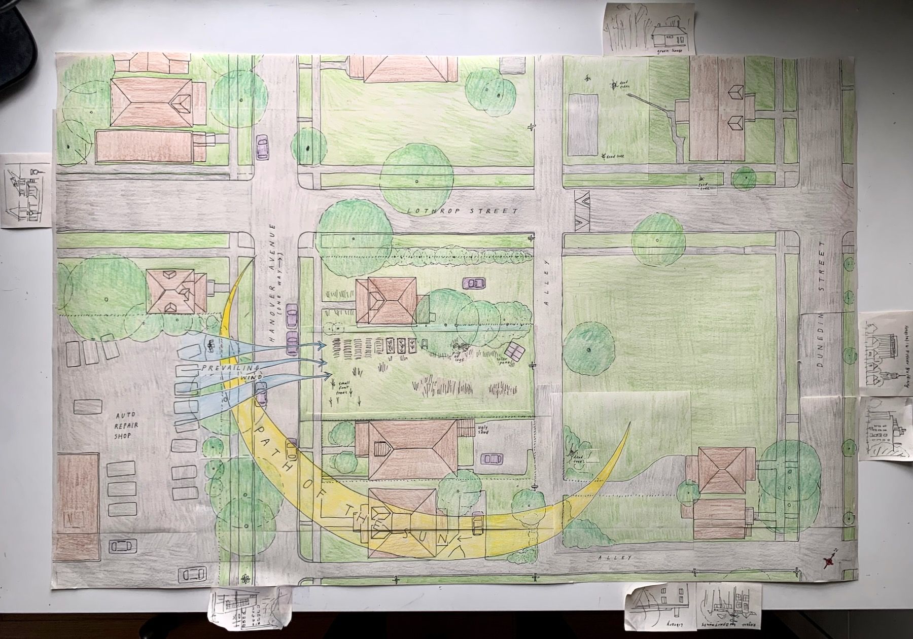 Every real-life house has an actual physical place. So we had to find, for even this hypothetical dream home, a real-life site we had access to; no designing in a vacuum. Some of my classmates in denser urban areas than Detroit chose parts of public parks for their sites. Mine was a vacant side lot that some friends own next to their house.