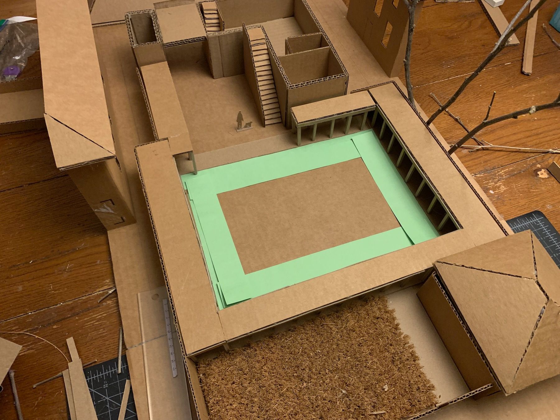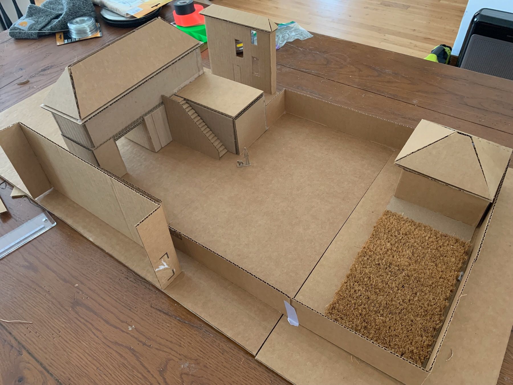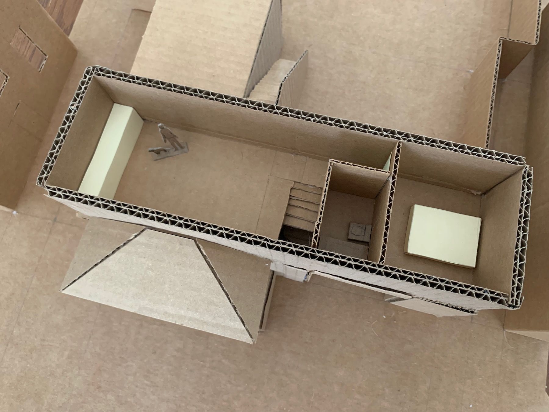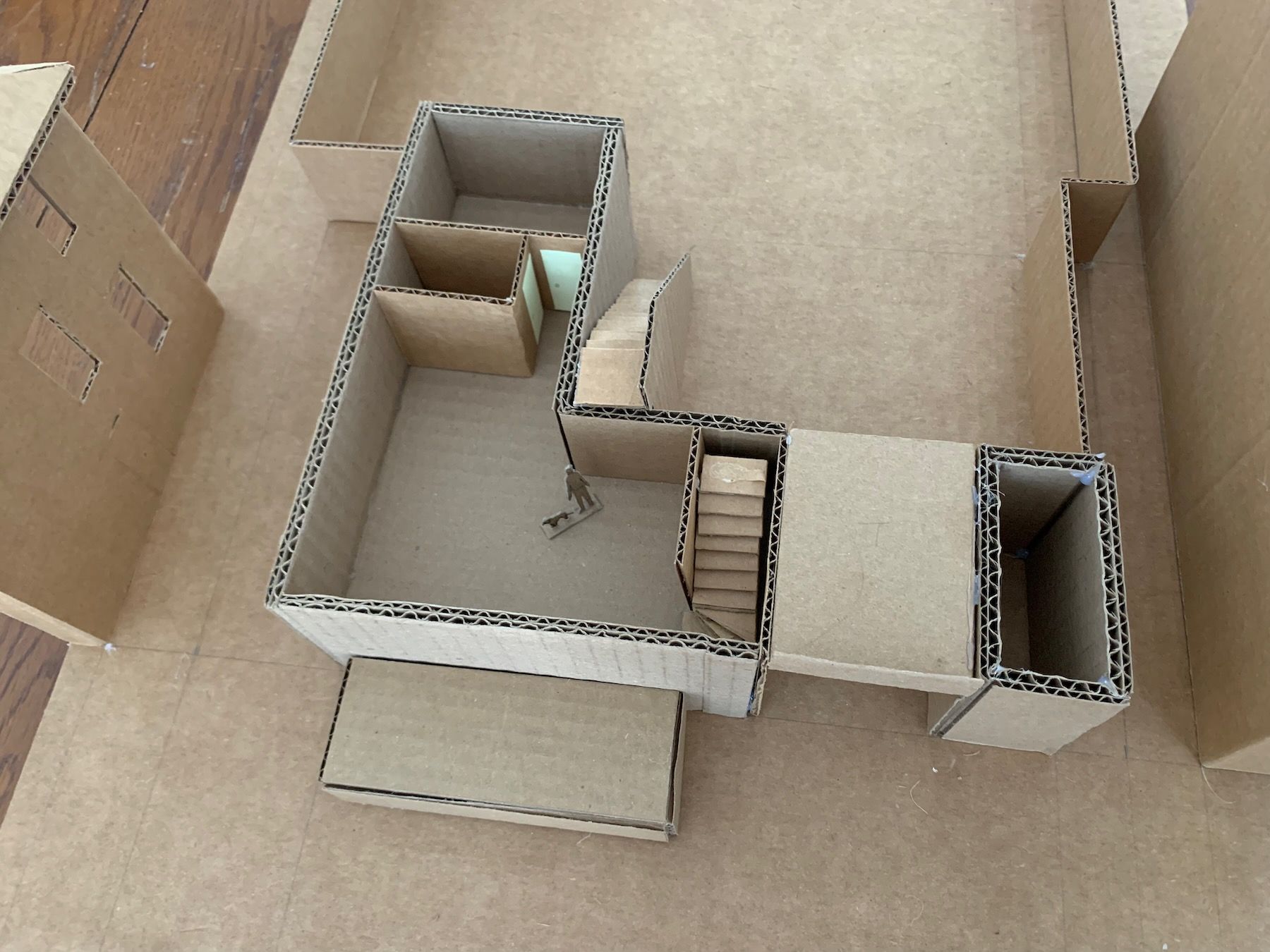 Materials-wise, I switched to cardboard and hot glue. This is a working model (meant to be ripped apart and experimented with) as opposed to a presentation model (meant to wow clients). I have to fight my perfectionism here because the goal is not to be super-precise, but precise enough that you’re accurately showing the relationships between things. The model should also be large enough to include some surrounding context (Always Be Contexting!).