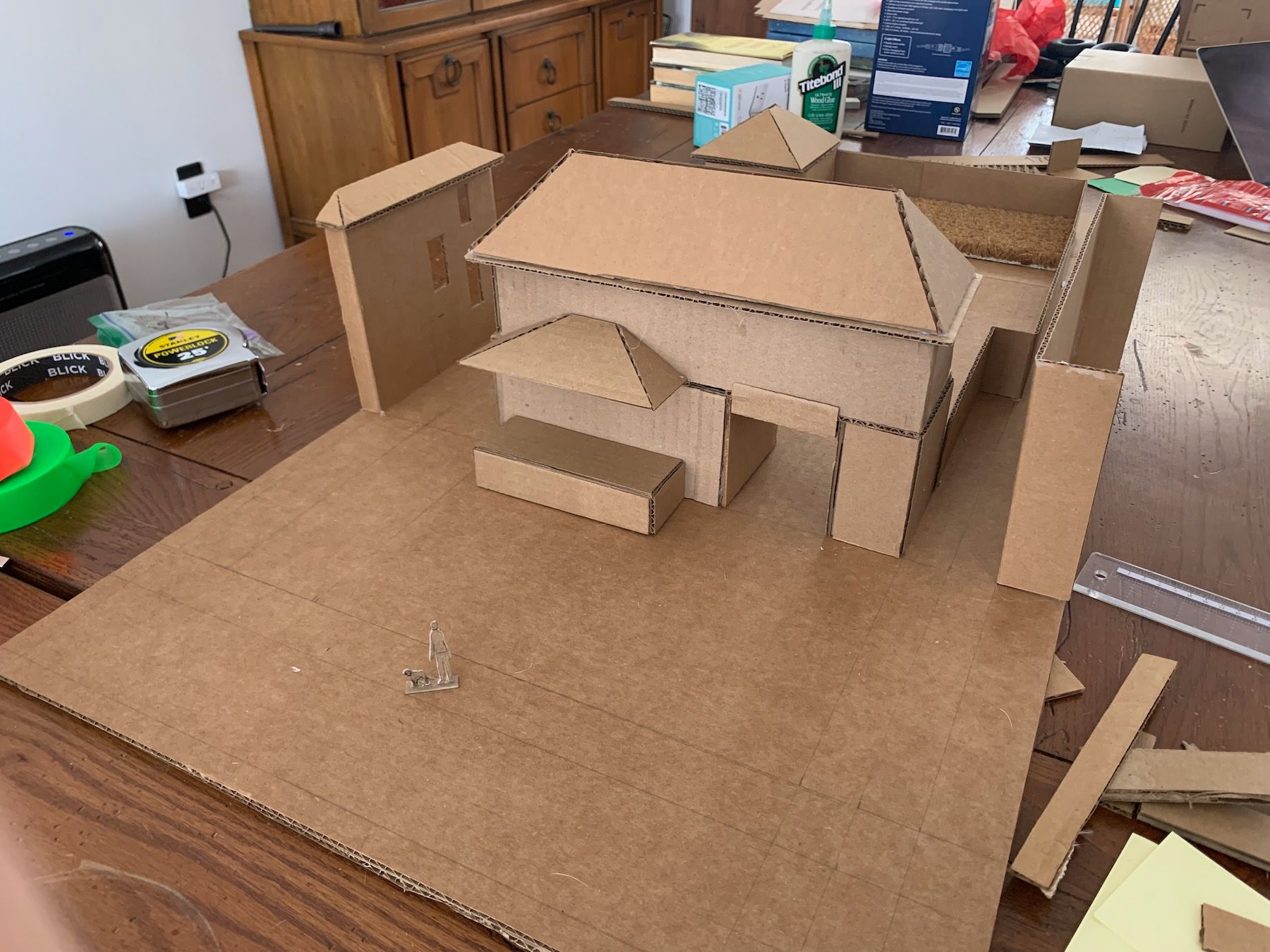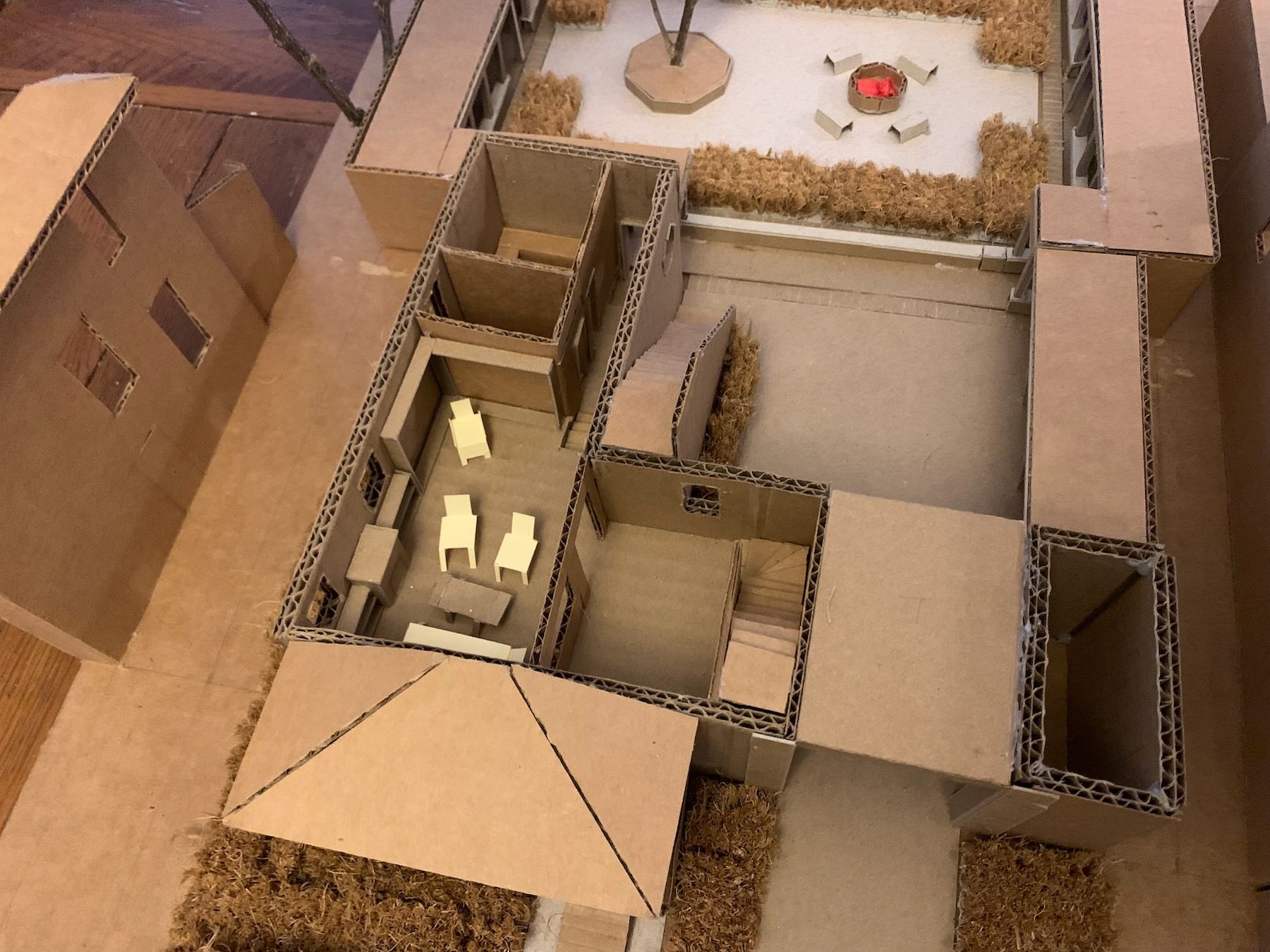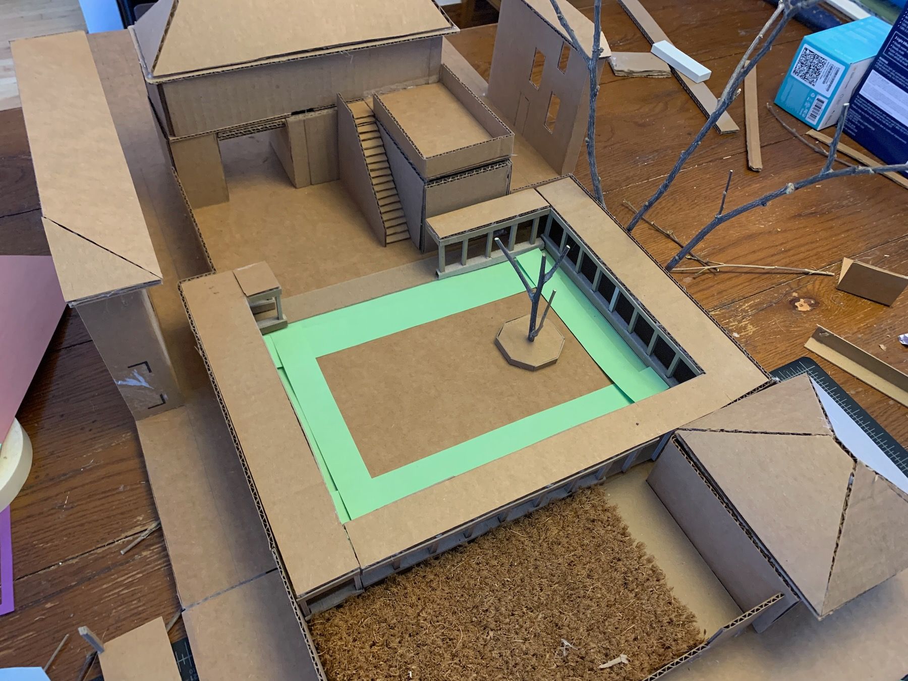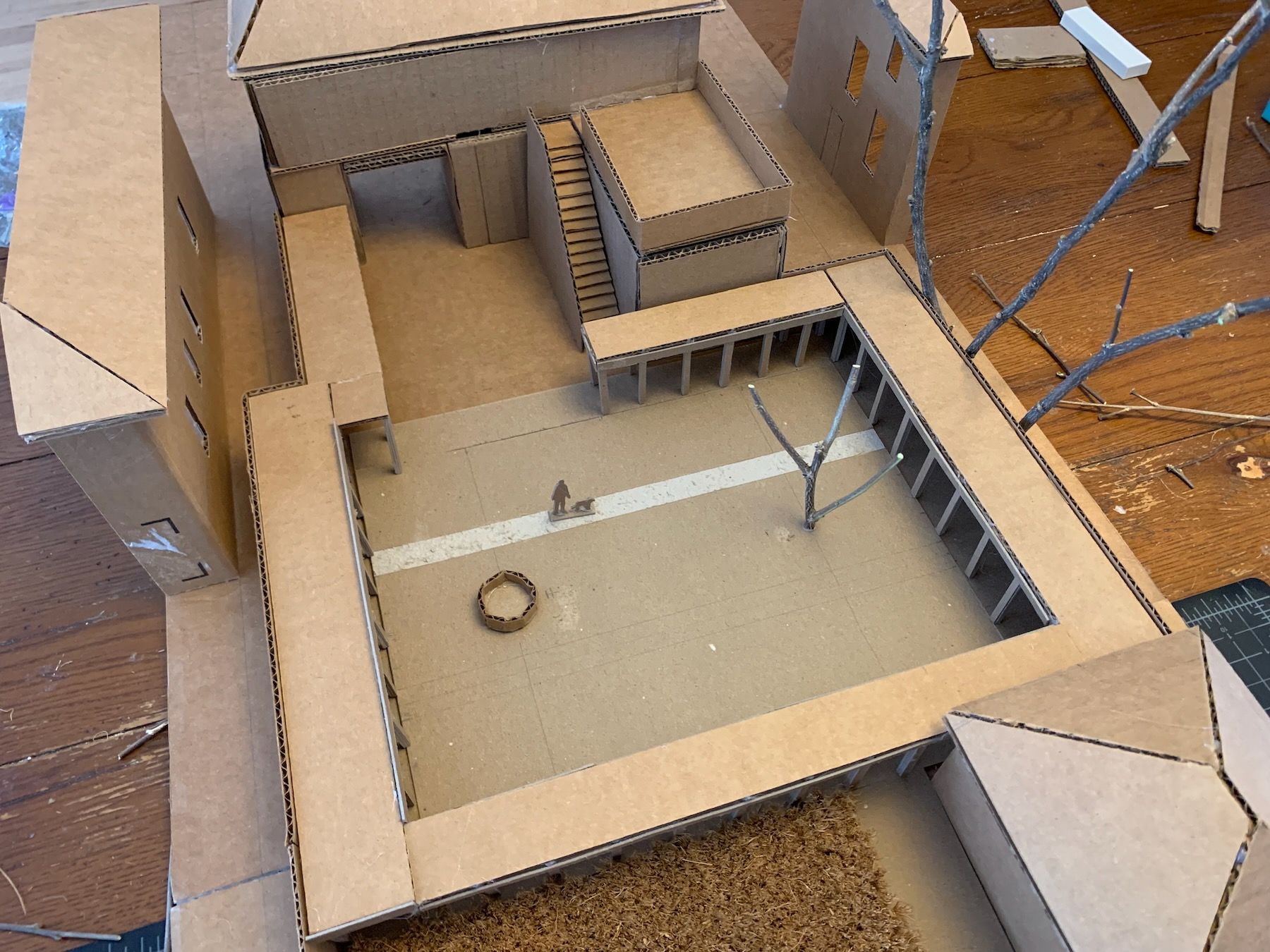 Materials-wise, I switched to cardboard and hot glue. This is a working model (meant to be ripped apart and experimented with) as opposed to a presentation model (meant to wow clients). I have to fight my perfectionism here because the goal is not to be super-precise, but precise enough that you’re accurately showing the relationships between things. The model should also be large enough to include some surrounding context (Always Be Contexting!).