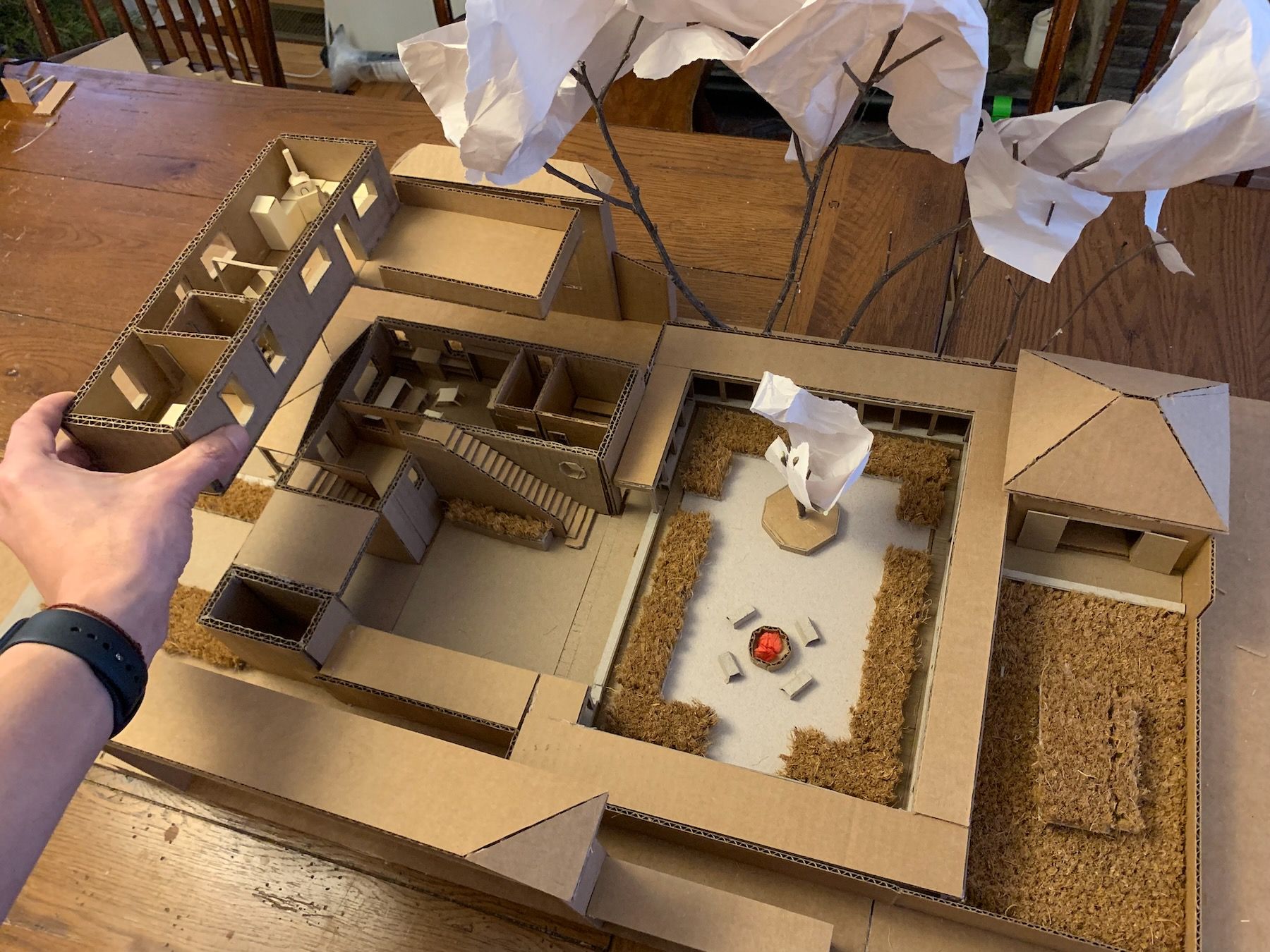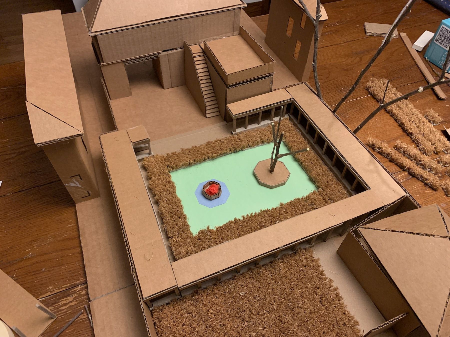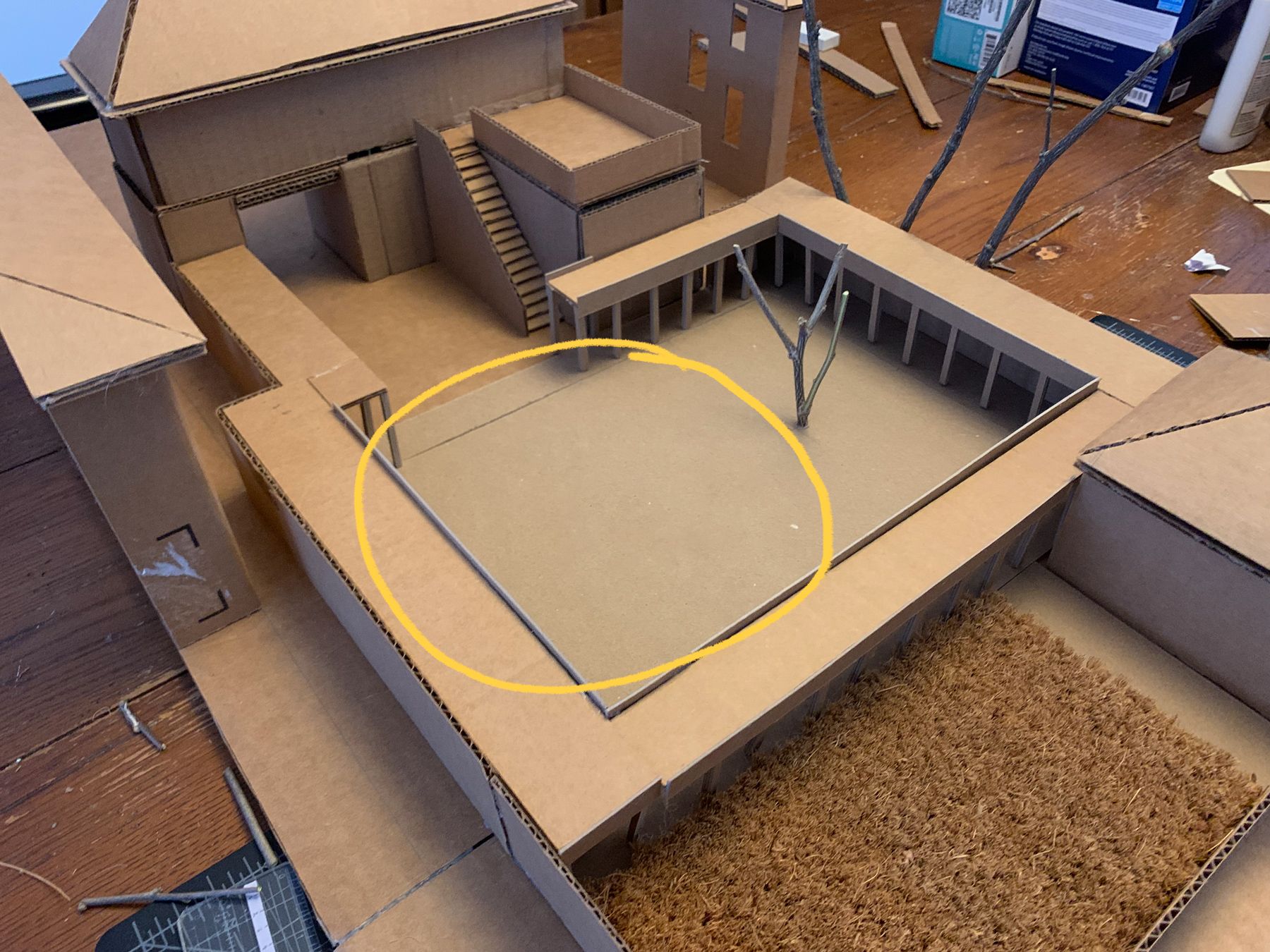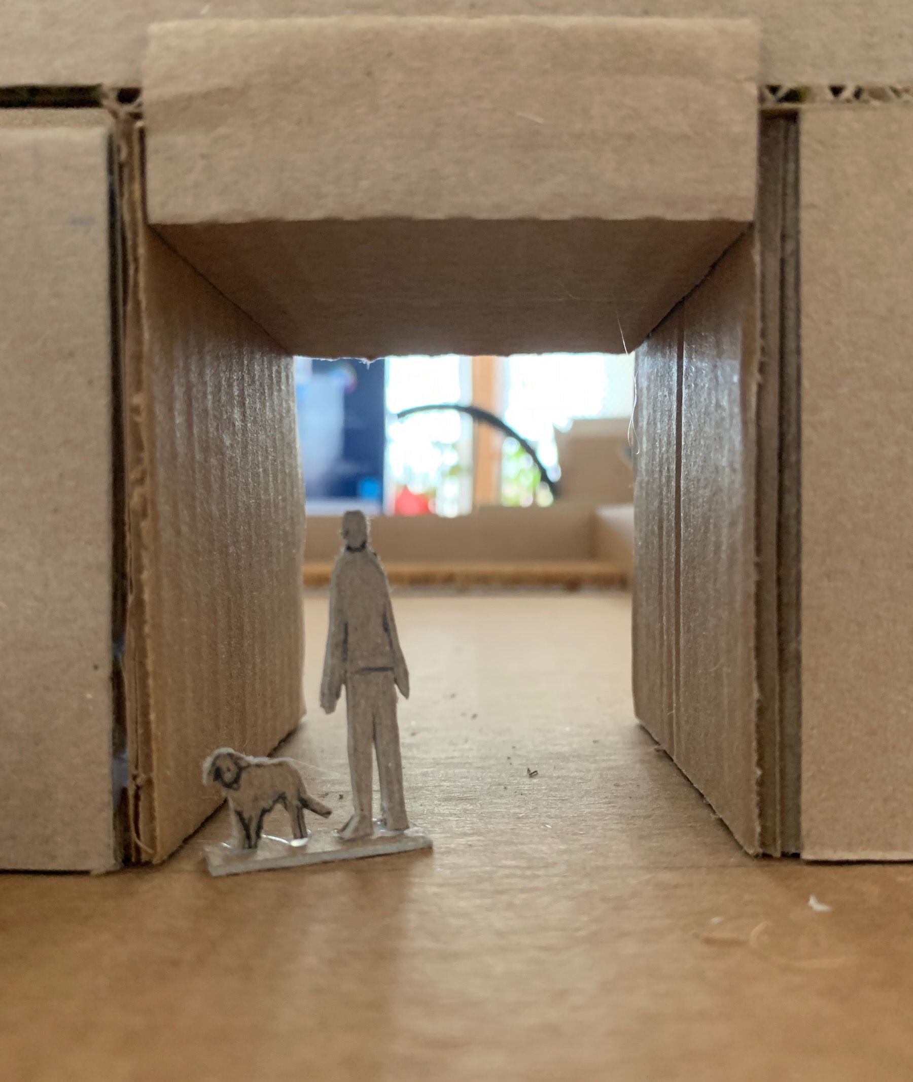 Materials-wise, I switched to cardboard and hot glue. This is a working model (meant to be ripped apart and experimented with) as opposed to a presentation model (meant to wow clients). I have to fight my perfectionism here because the goal is not to be super-precise, but precise enough that you’re accurately showing the relationships between things. The model should also be large enough to include some surrounding context (Always Be Contexting!).