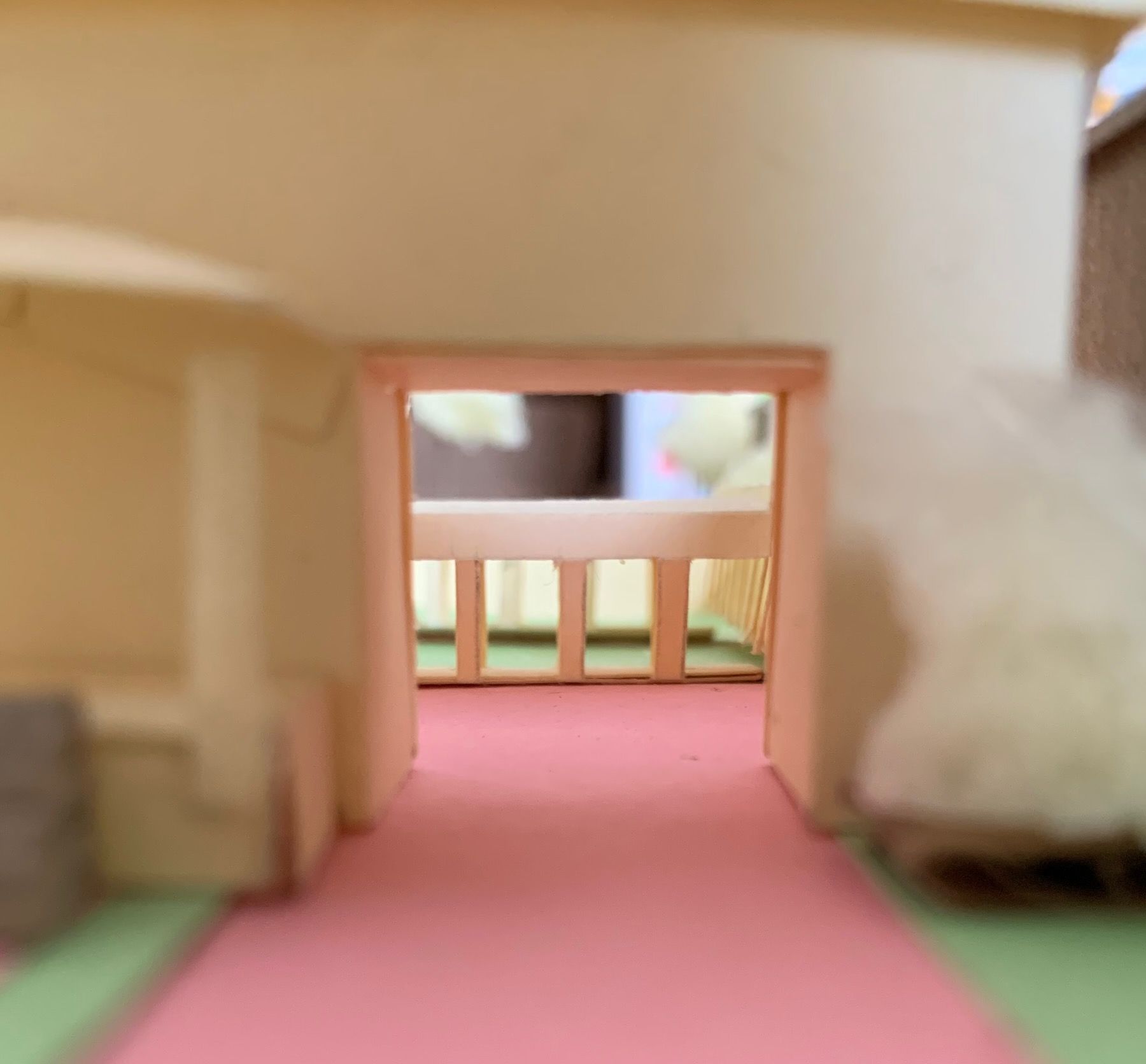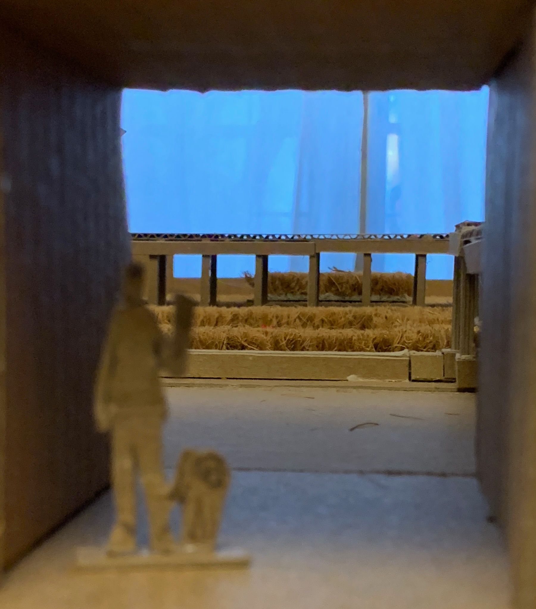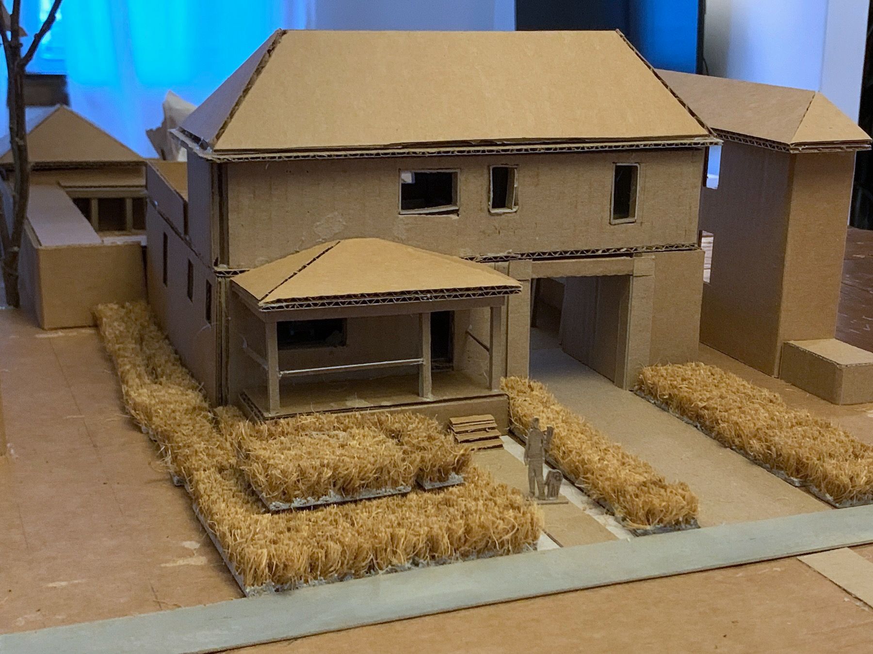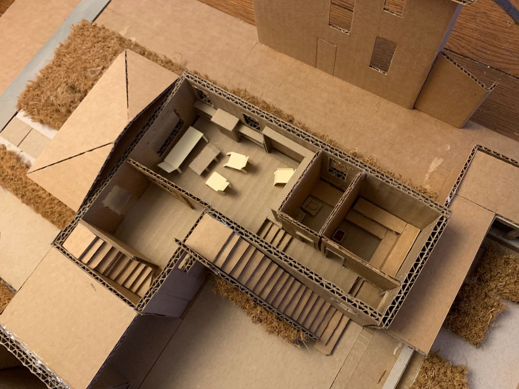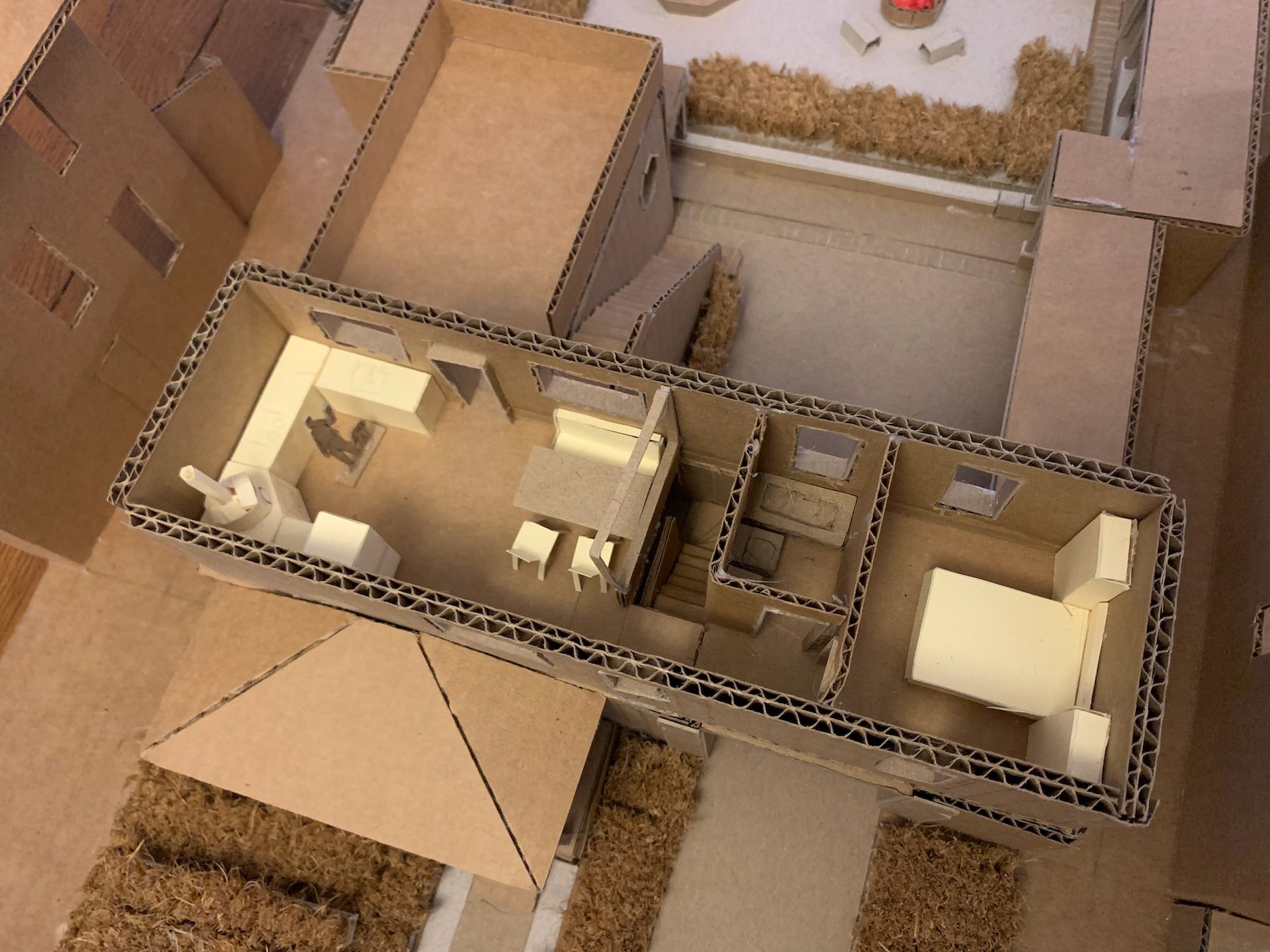 The native prairie plantings I imagined next to the workshop outbuilding is cut from an IKEA coir door mat, a tip I got from a great YouTube video. At this larger scale, I can more easily model the insides of the rooms as well, so I built the house in a way that I could remove the roof and separate the upper floor – like a dollhouse: