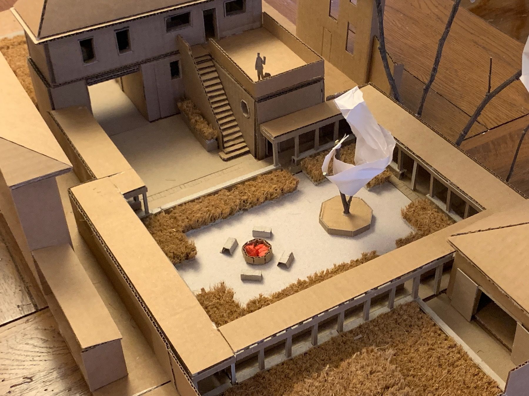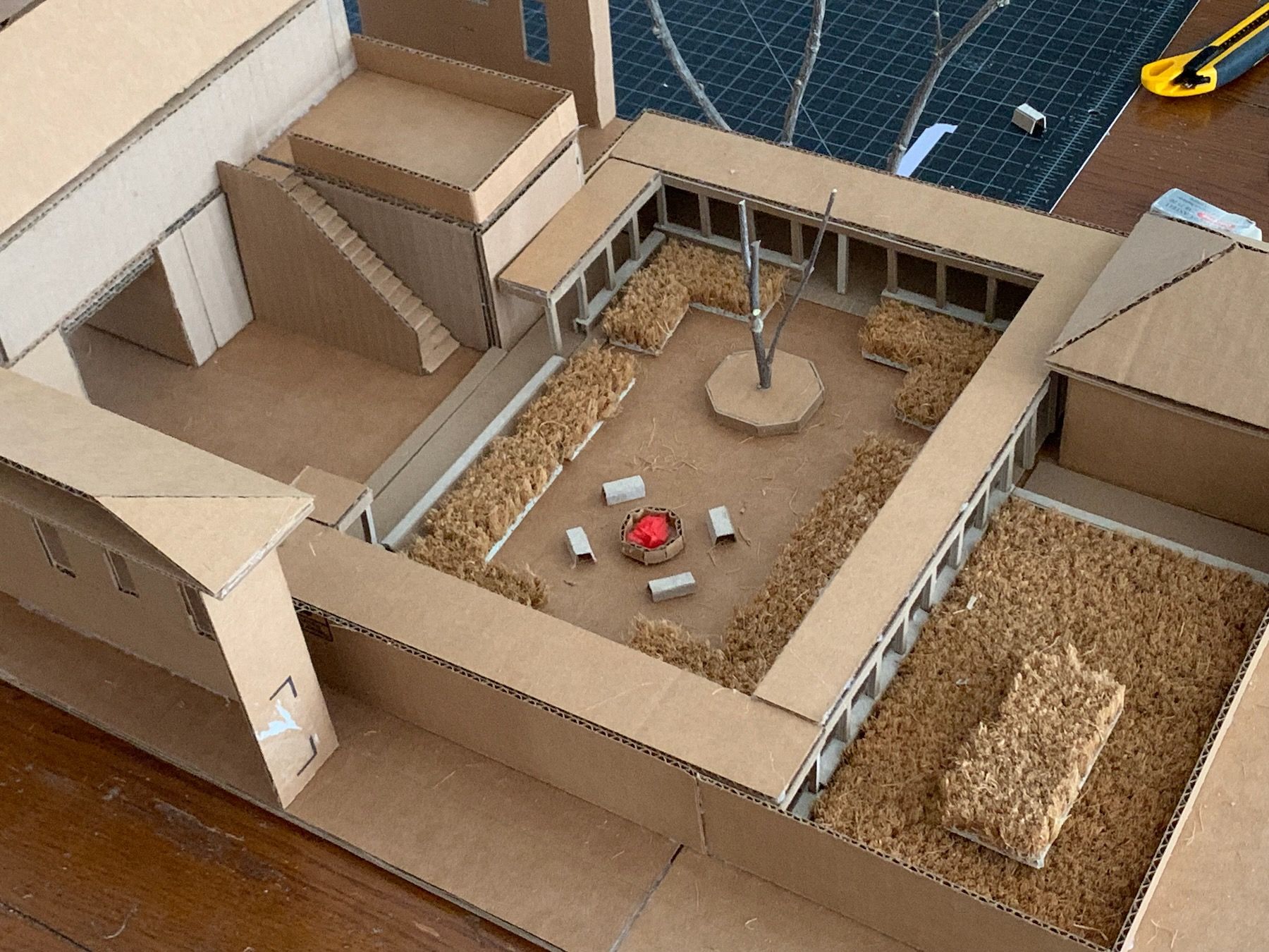 Once I was satisfied with the size, I placed the tree and fire pit again, also thinking about how to make each of them more of a place. I added a low sitting wall all around the colonnade – another boundary of sorts – as I’d pictured being able to sit along it looking into the courtyard: