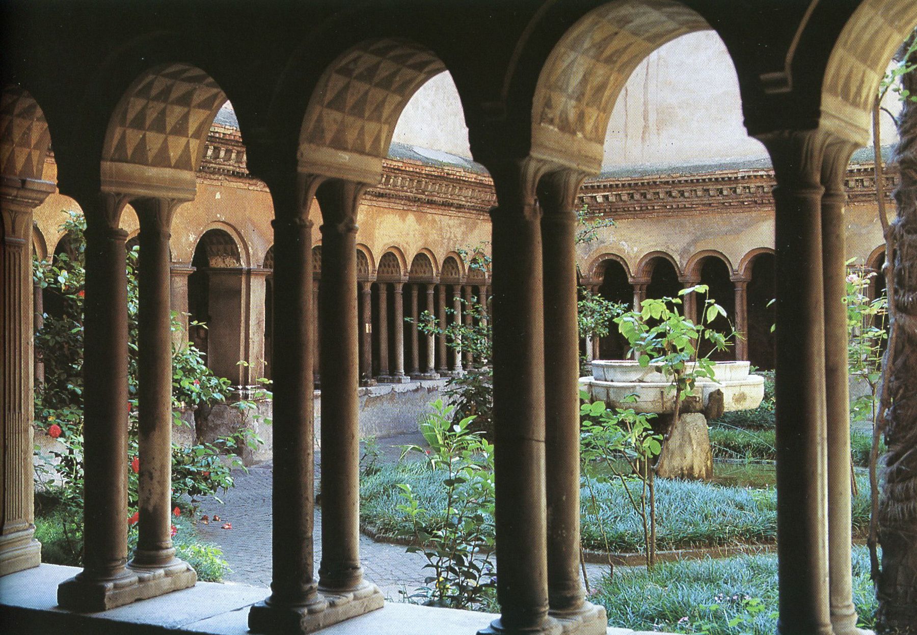 This was feeling better, but the courtyard was still a bit plain. I got somewhat stuck here and started looking at references for cloisters and courtyards for inspiration. The ones I found most appealing tended to have paths and plants in them: