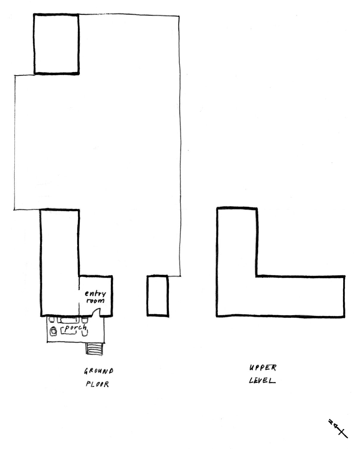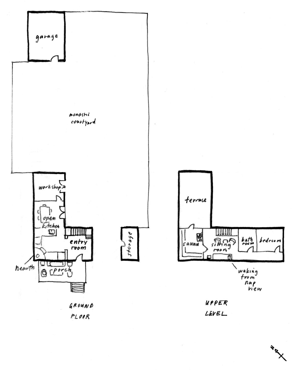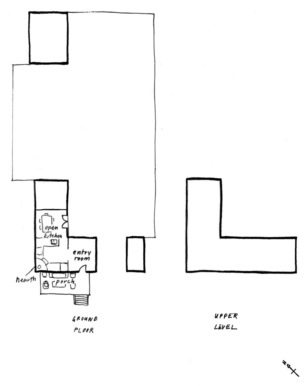 At our class review, one of my instructors suggested moving the kitchen to the upper level. Yes, I’d have to carry groceries upstairs, but it was a minor inconvenience given what I would gain in terms of light and feeling. I quickly doodled another floor plan, not worrying too much about being overly precise:
