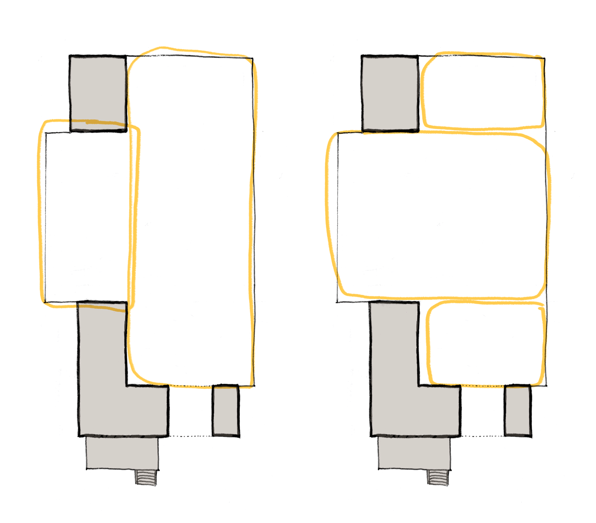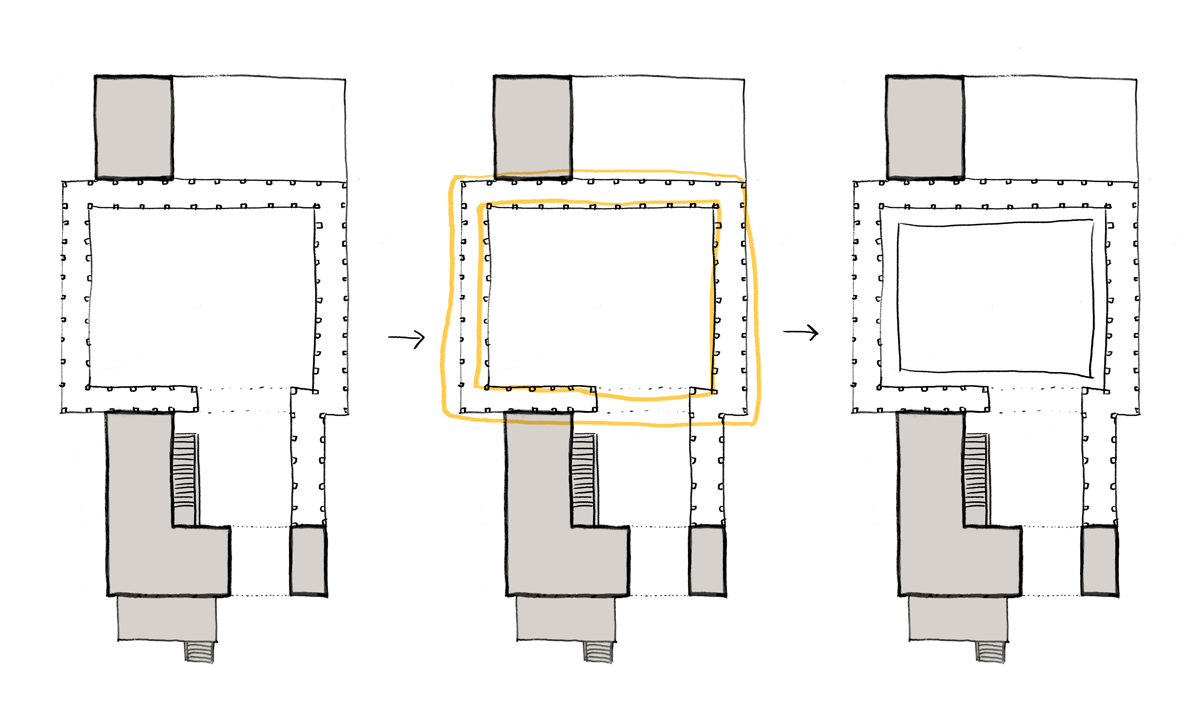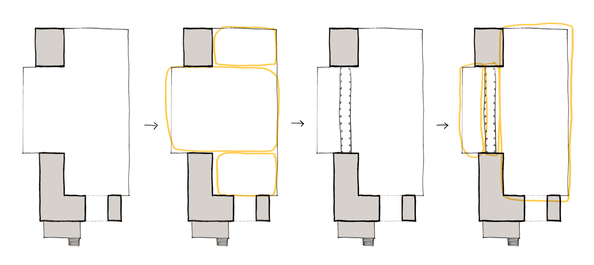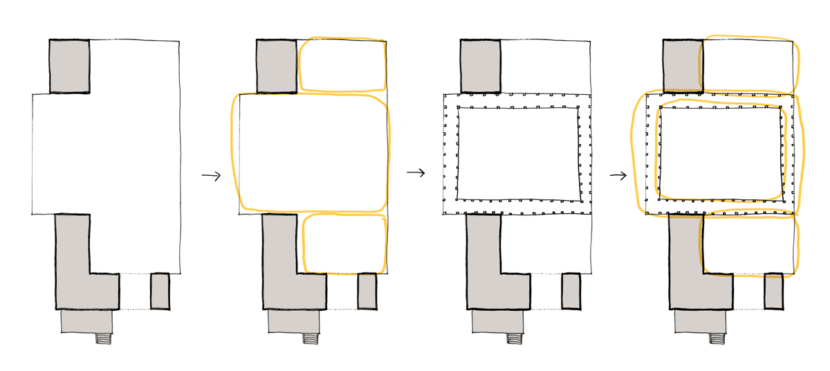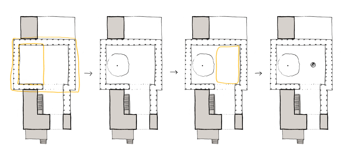 Another takeaway I had was that stuckness in the design process could be a sign that I’d made a misstep somewhere along the way, that I’d done something in the wrong order. In my case, I jumped straight to adding the tree, a literal low-hanging-fruit decision. To go back to the centers diagrams, I saw two halves to the courtyard space and did this: