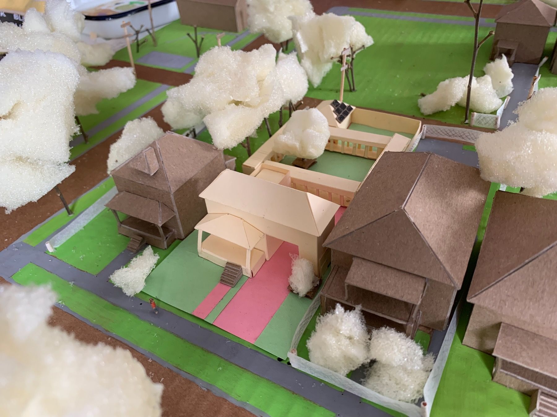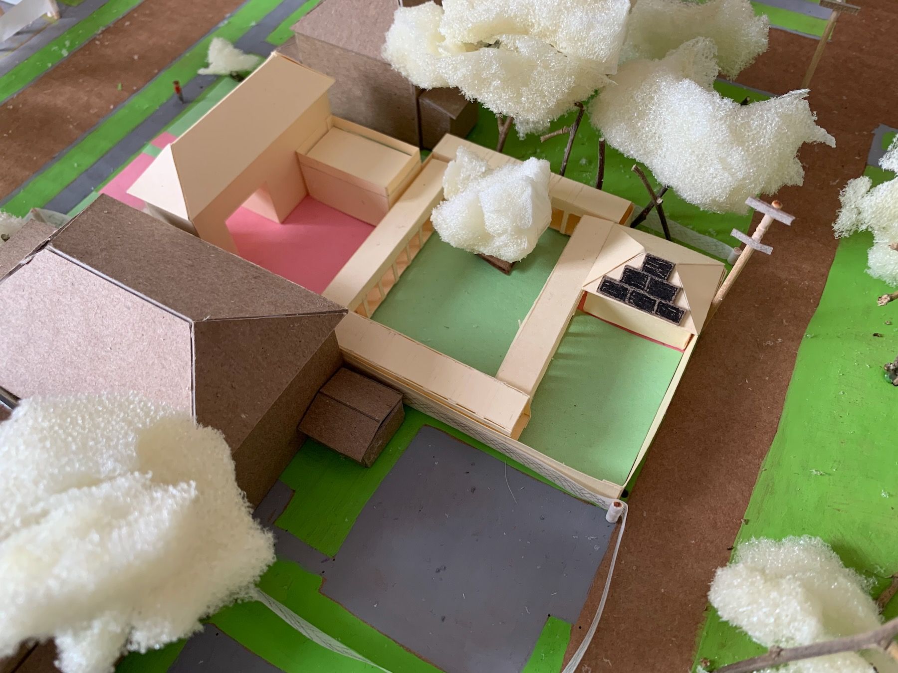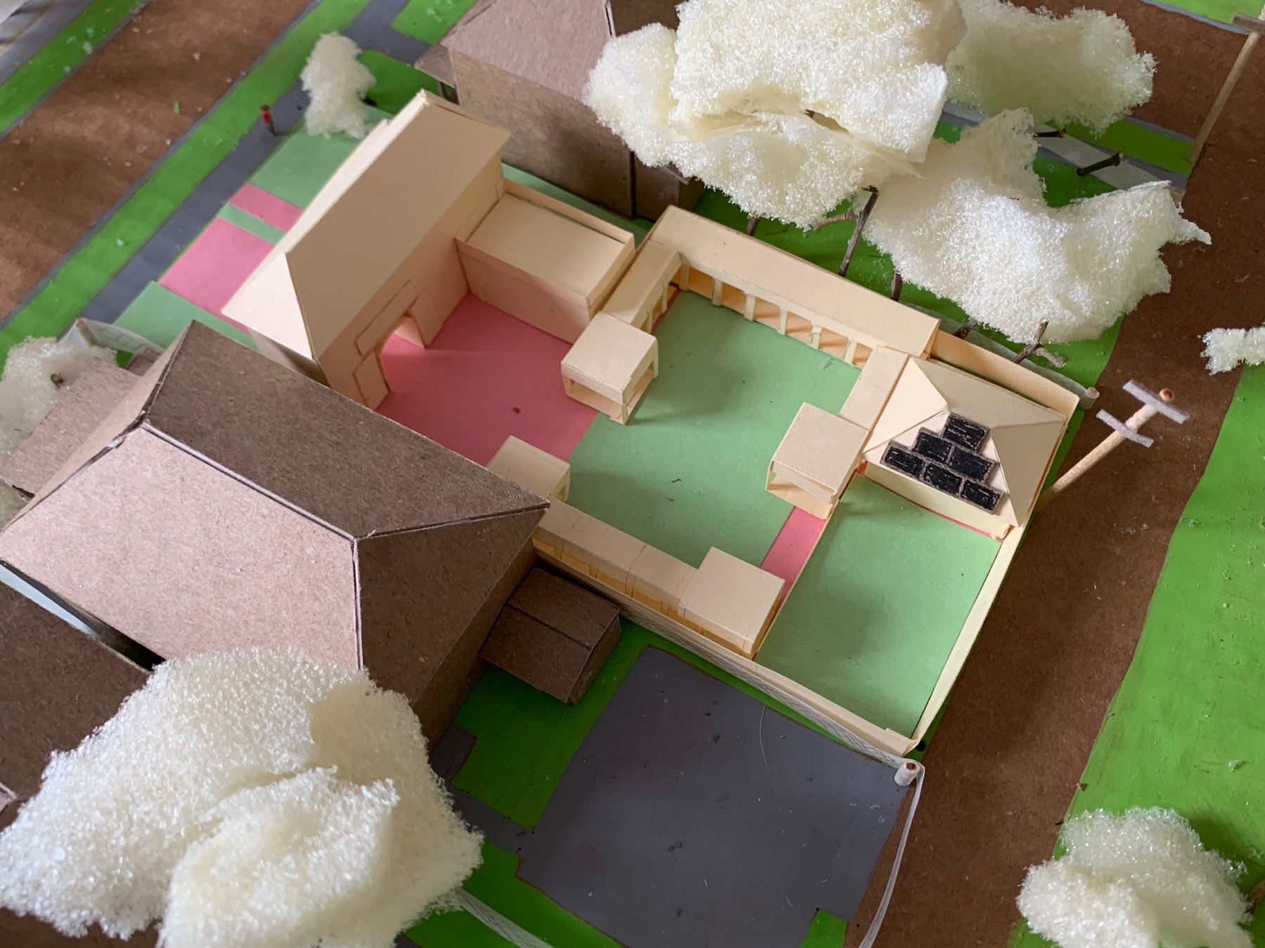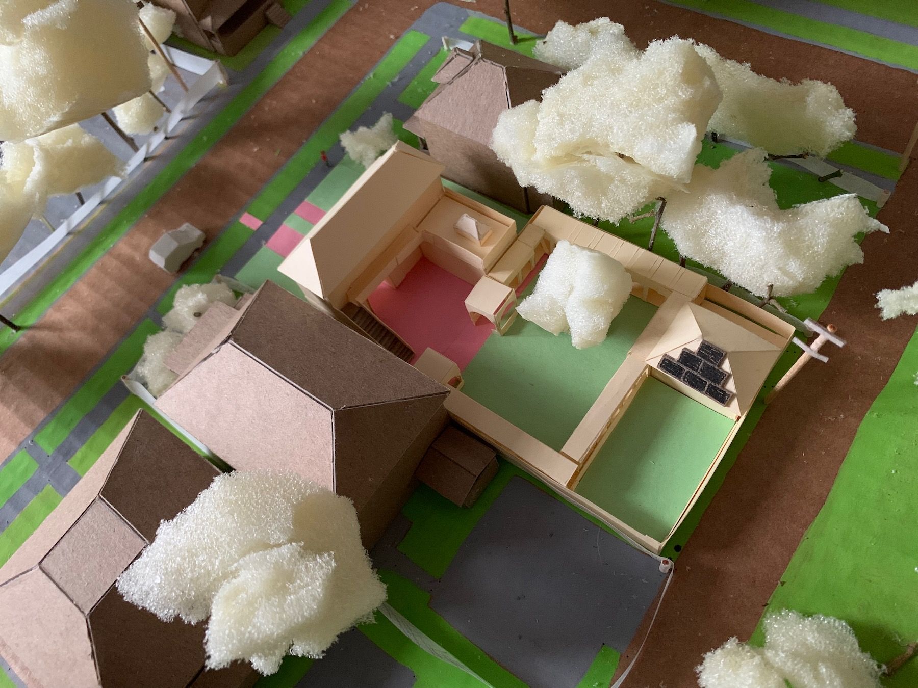 I modeled these changes, along with walls at the sides of the lot to cover up or replace the existing chain link fences. Then I started defining which areas of the yard were grass/plants (green construction paper) and which had harder ground cover (pink). I plopped in a small tree (more on this later) and simplified the main roof so it was no longer an L-shape: