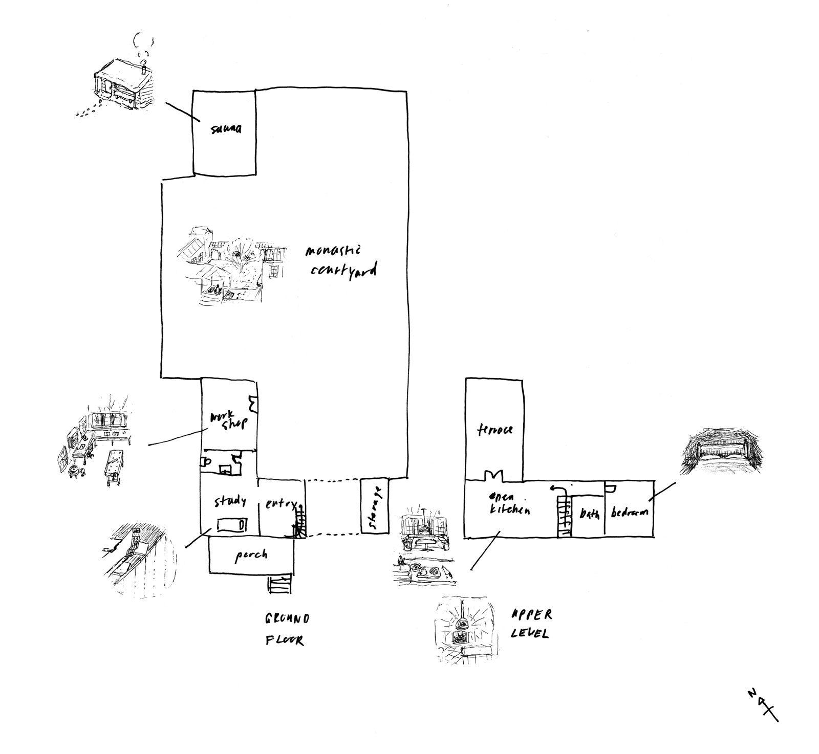 Monastic Courtyard – An outdoor space welcoming contemplation, with a tree or two to mark time’s passage. A sheltered spot to meditate year-round, and covered paths and arcades for walking meditation.