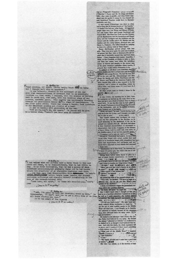 I print out the full manuscript at 1.2 line-spacing with a wide right margin of 3+ inches. In other words so the text block appears more closely the way it appears in a printed book. I can’t remember how long I’ve been doing this but I know I started doing it because of a manuscript page of The Great Gatsby I’d seen in a biography of F. Scott Fitzgerald (and misremembered):