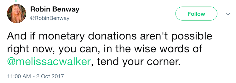 Maybe I was too much in my own head. But I honestly believe that there’s a broader awareness possible, and worth striving for, at times like this (or all times). There are ways to pay better attention, and let yourself be affected, then effected – a steep and narrow peak between complacency and paralysis. Something in this tweet this morning strikes me as potent, a potential: