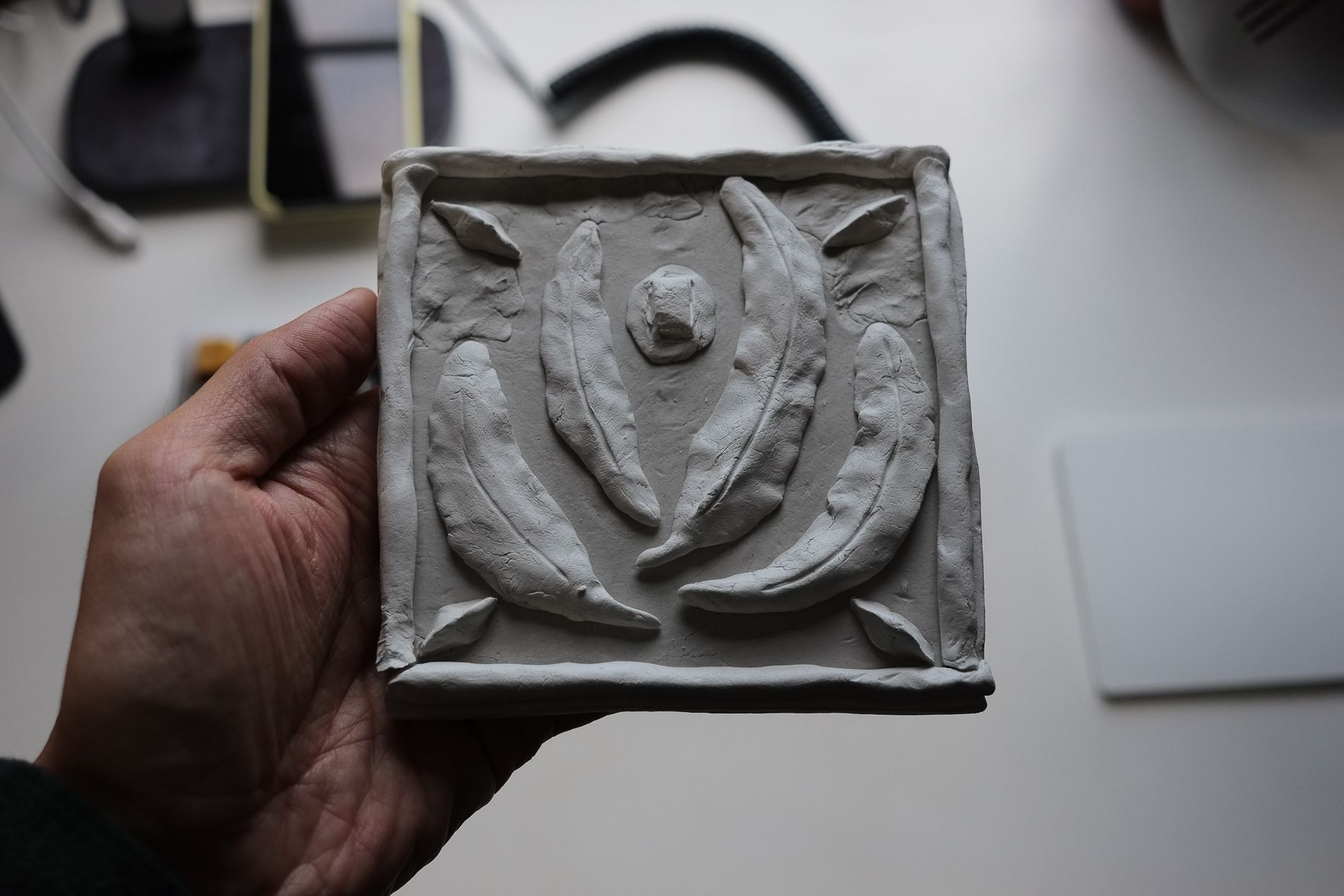 I can’t end this week’s letter on a glorified course catalog. So here’s the result of my Friday Studio class, where we jumped right in with knives and modeling clay and tried to create, with deliberately light overall direction, a beautiful tile: