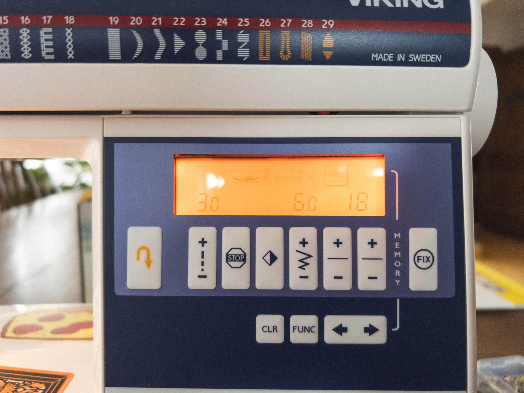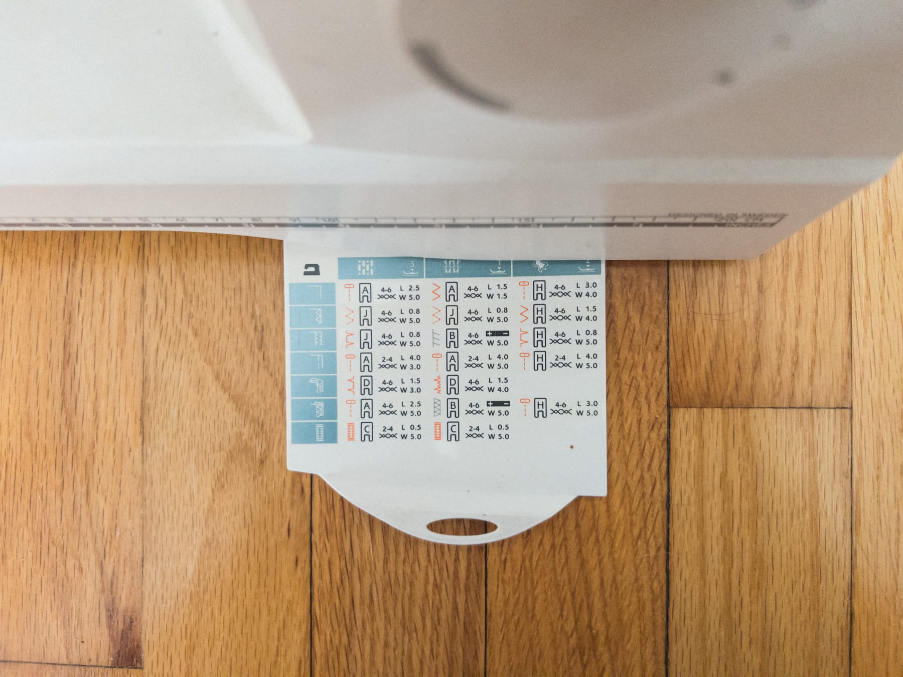 Some sewing machines, like the two we have in our house, come with built-in reference charts and memory aides. Julia’s, inherited from her mom, is electronic and programmable: